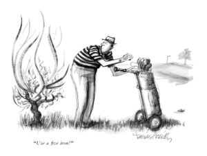 I found a cartoon drawing by Donald Reilly that features a golfer getting advice from a burning bush on the golf course. This depiction shows a different perspective. An additional point of view. One that resonates with me as a result of my own story. There was a time when I played a lot of golf. I never saw a burning bush, but I encountered God.
